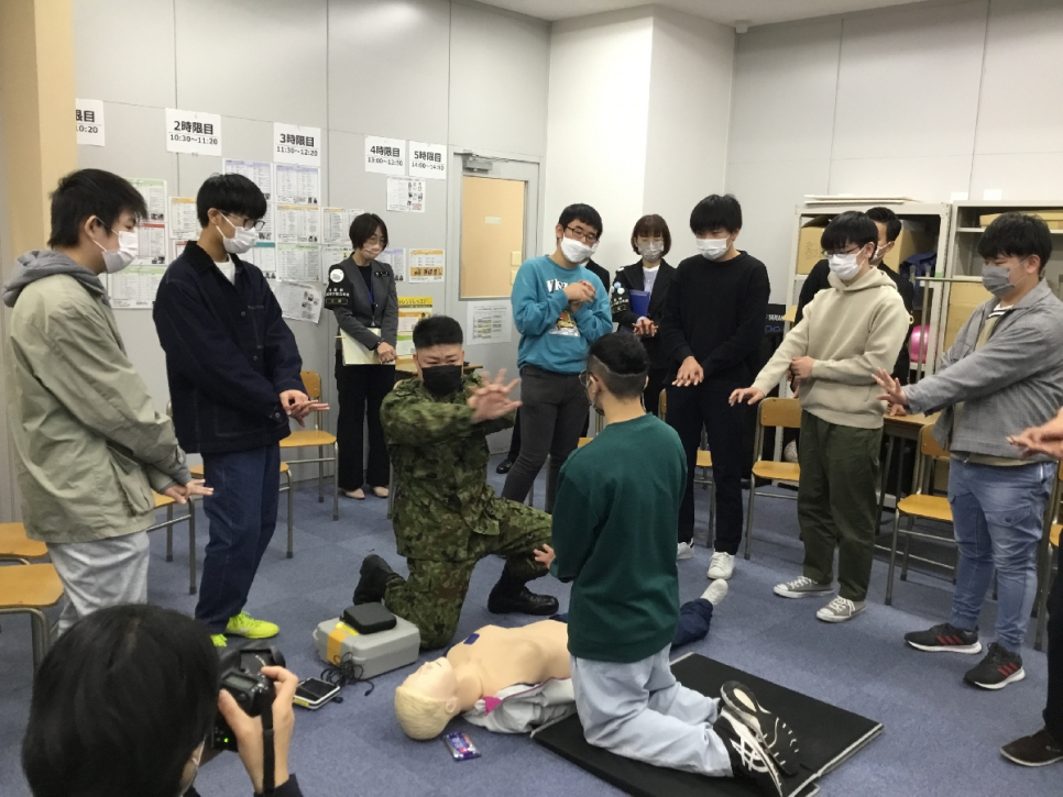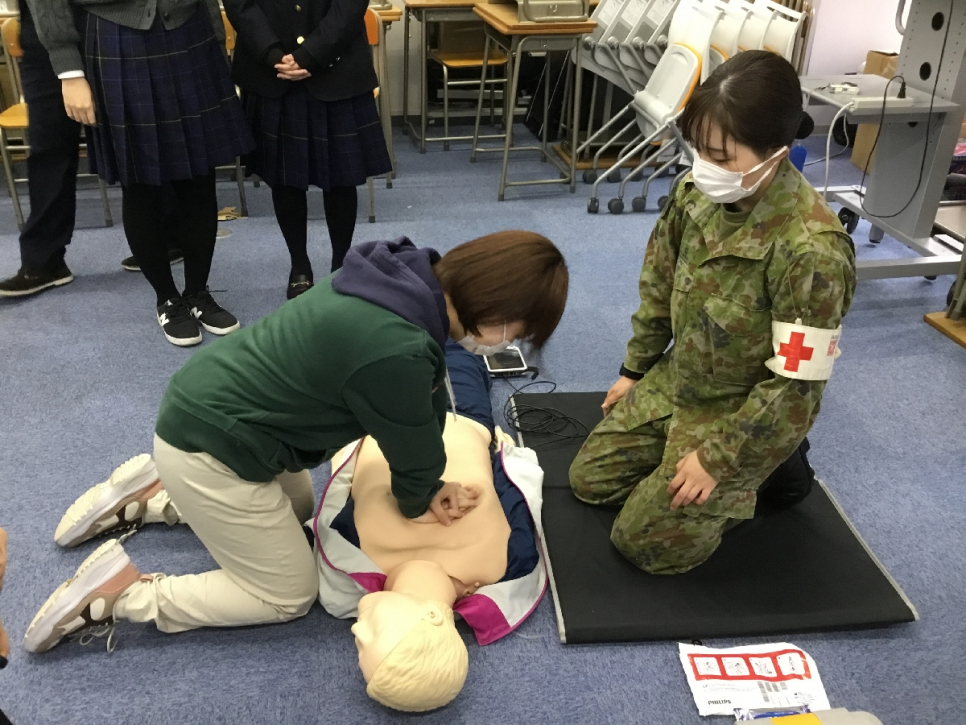 自衛隊の方にお越しいただき、心臓マッサージの方法や実際にAEDを用いた対処法を学びました。