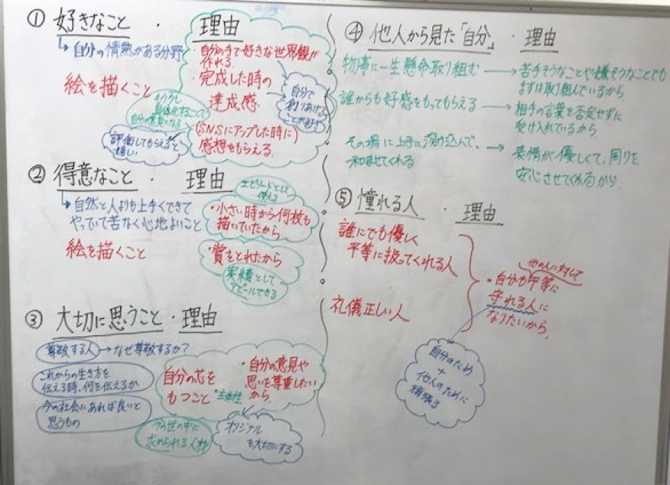進路についての授業では大学と専門学校の違い・就職の流れといった仕組みの紹介以外にも自己分析を通して自分の強みや描く将来像をハッキリさせる内容にも触れます。
