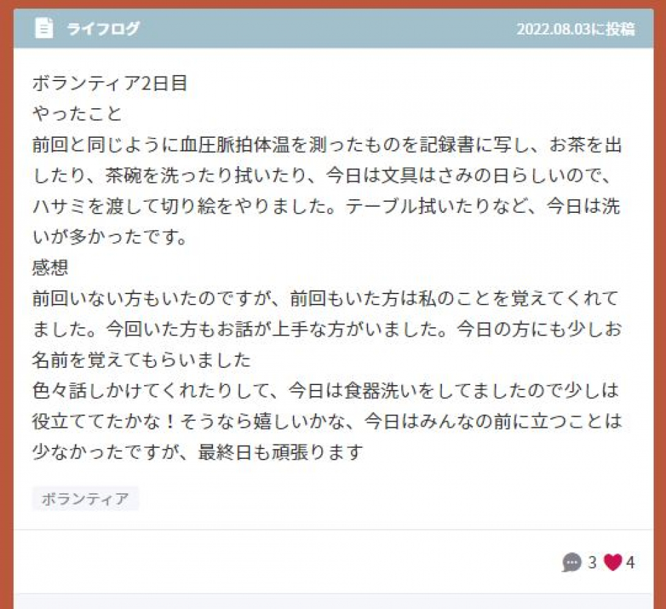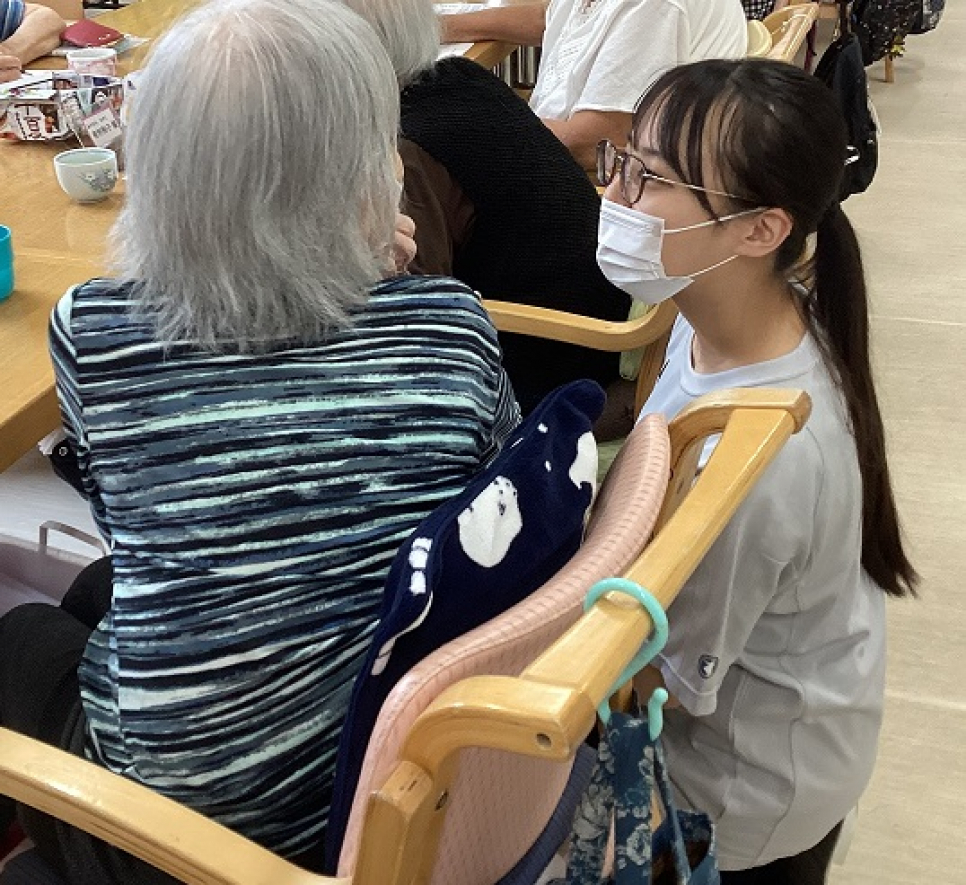 そこでは、話すときの目線の高さや声の大きさ、メモのやりとりなど工夫をしながらコミュニケーションをとっている姿や、慣れない配膳準備、レクリエーション中の先導など、自分のできることを懸命に探して取り組んでいる姿を見ることができました!
