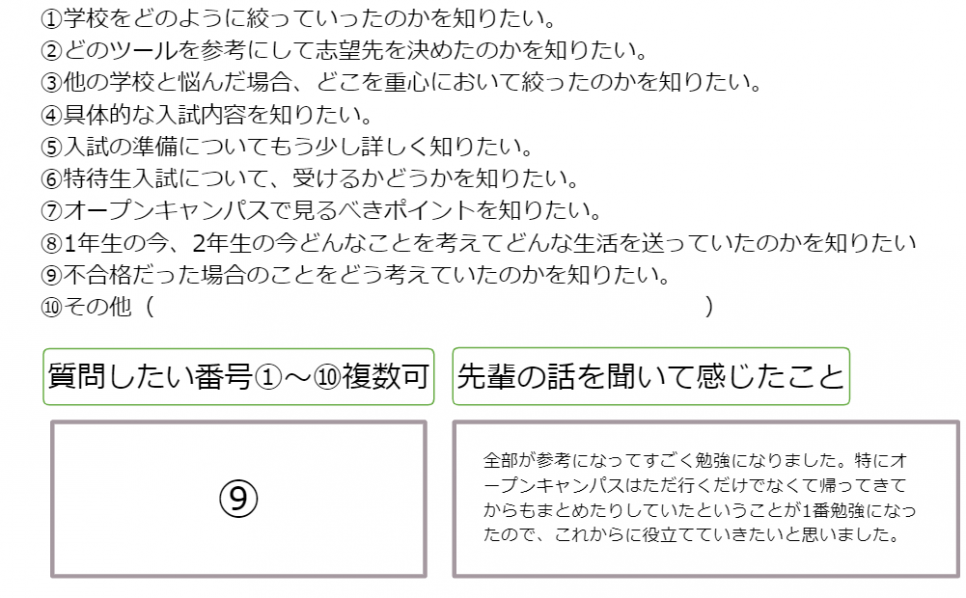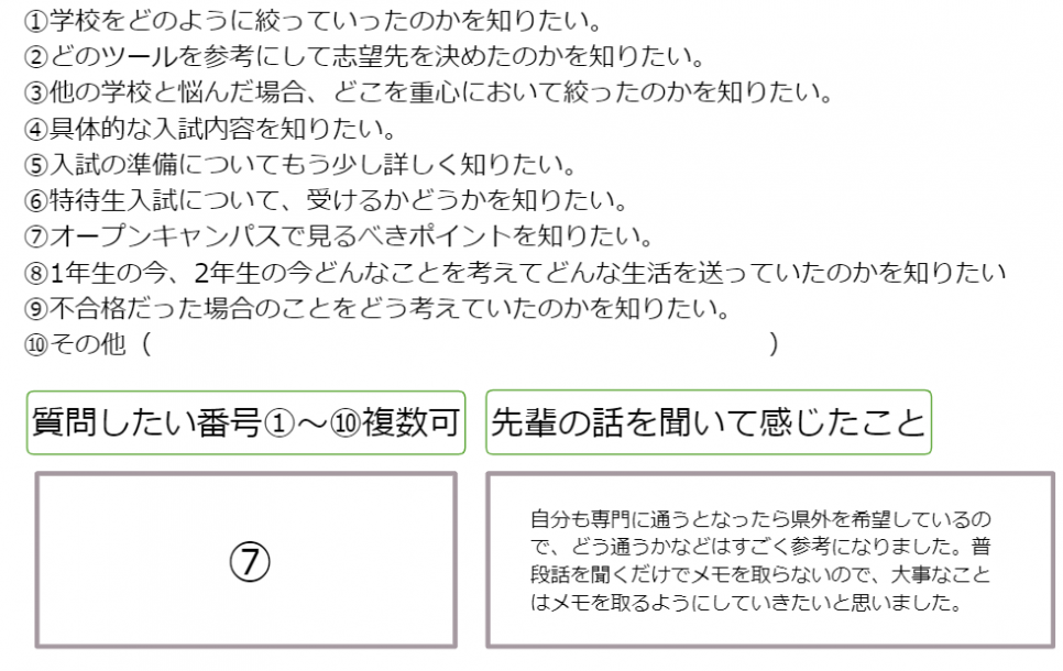 ・面接対策や心構えの話がとても参考になった。オープンキャンパスで見るべきポイントも参考になった。