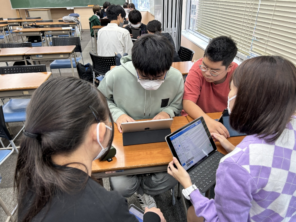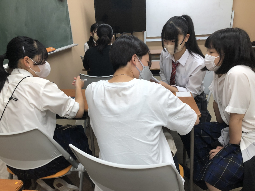 授業では、グループワークを取り入れ、グループで話し合い、調べながら学習することも大事にしています。自分の意見を言う時は緊張しますが、相手に思っている事、感じた事を伝えるのはとても大切であり、みんな緊張しているのは同じです。相手の意見を聞いて、気づきや学びも大いにあります!!