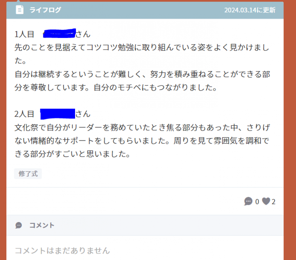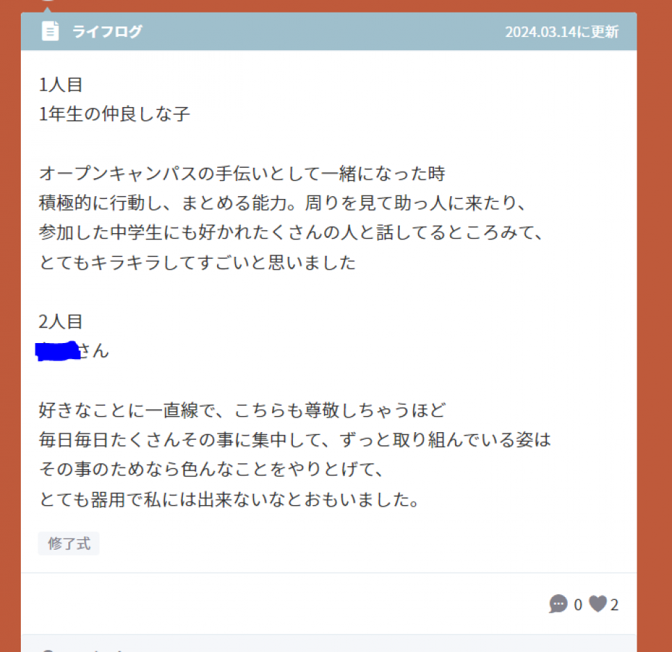 身近な大人などを挙げて、その人への称賛をおこないました。