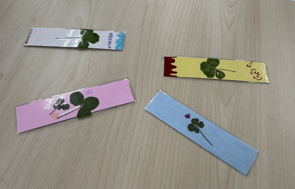 今回は、先日の交流会で摘んできたクローバーを押し花にし、「しおり」作りに挑戦しました。