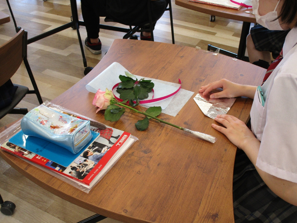 持ち手を作るために余分な葉っぱをとったり、枯れないように水を含ませたコットンを巻き付けたりして、お花が長持ちするような工夫をしました。見栄えの良くなる蝶々結びの仕方を教えてもらい、とってもかわいいラッピングができました!