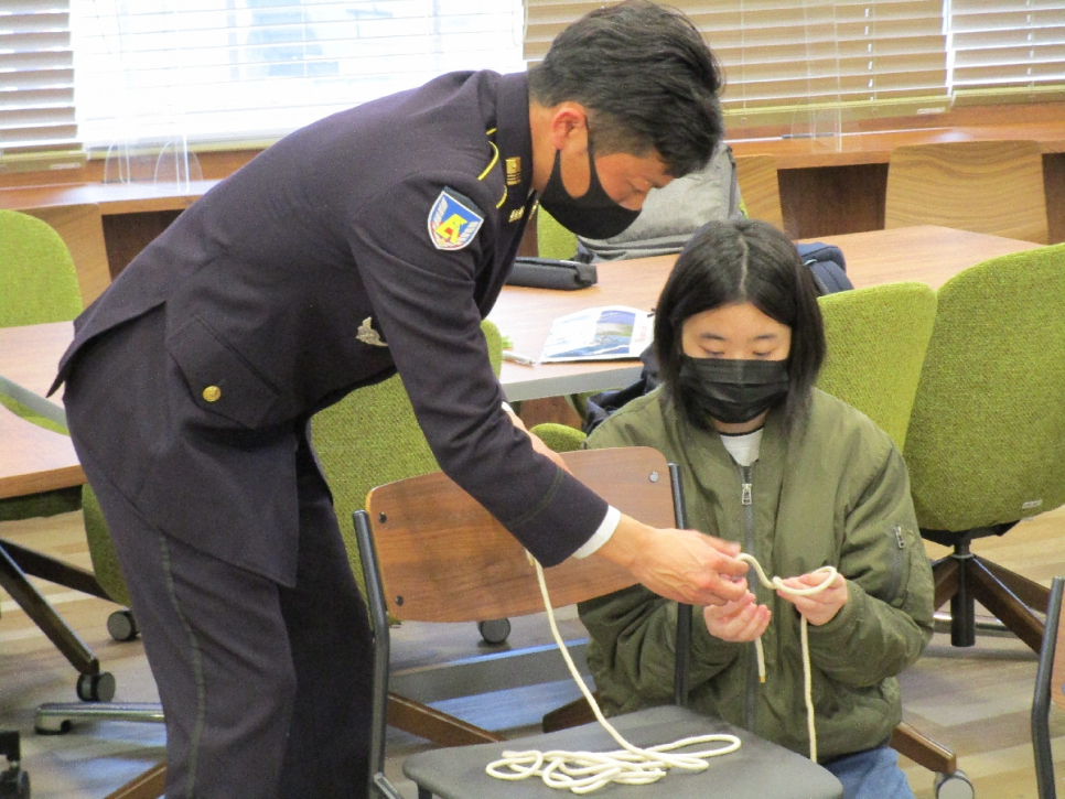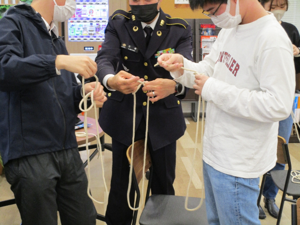 また後半は、ロープワークの演習をしました。アウトドアやキャンプで役立つロープの結び方を何種類か教えていただき、実際に挑戦!簡単に結ぶことができるのにほどけにくい結び方をマスターすることができました。