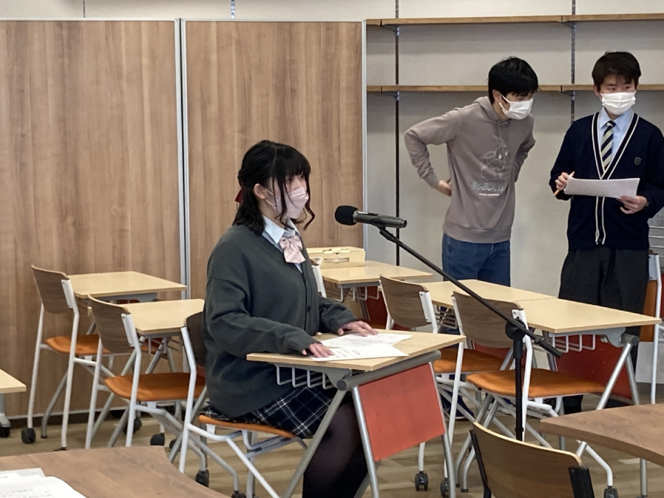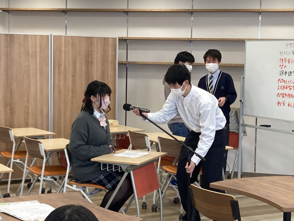 後半では、実際のニュースで使用された原稿のコピーをもとに、アナウンサー役とディレクター役に分かれニュースの番組製作体験をしました。アナウンサーはニュースを読む役で、短い時間内にどこまで伝えるかを考えます。また、ディレクターは音声のチェック、映像のチェック、そして最後のキュー出しまでを行いました!
