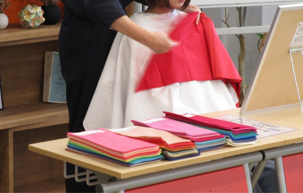 実際に体に布をあててみると、同じような色味でもパッと顔色が明るく見える色と、逆に顔色が悪く見えてしまう色があり、その見え方の違いに驚きました!