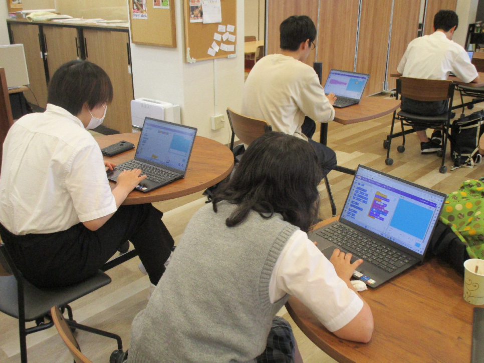 「プログラミング体験」では、パソコン初心者でも簡単に操作することができる「Scratch」というプログラミングソフトを使用して、ゲームを作成しました。