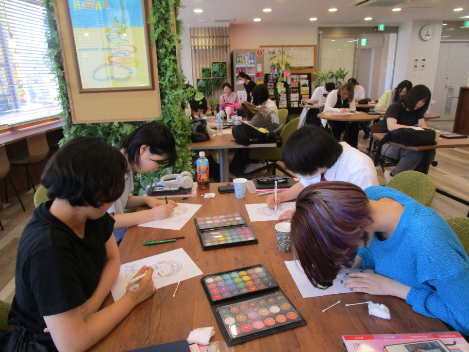 本物のメイク道具を使って、デッサンシートにメイクを施していく授業です。