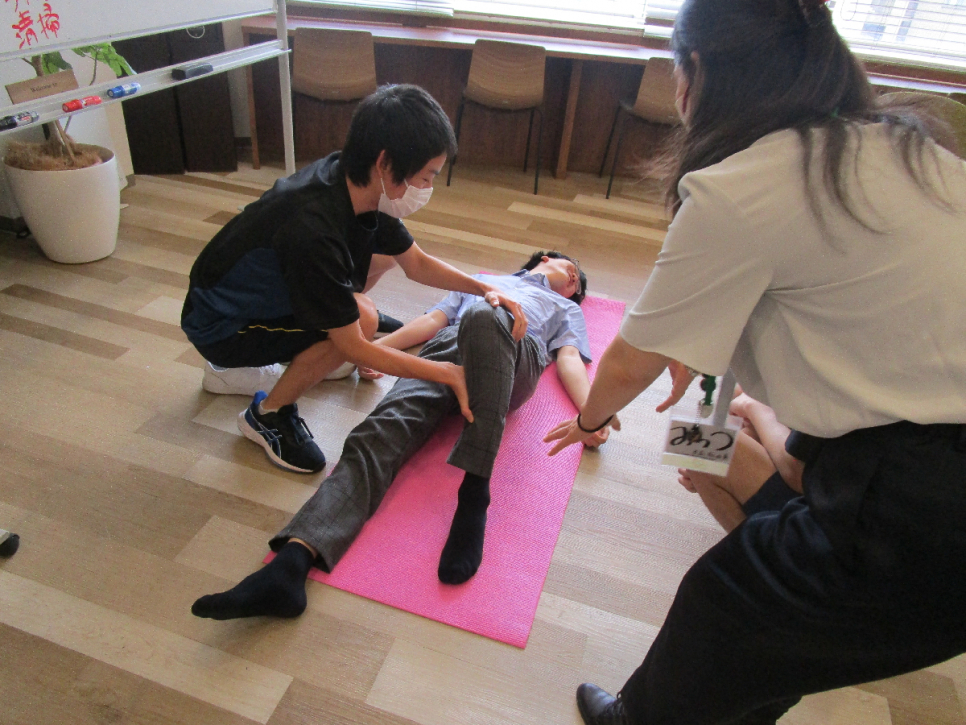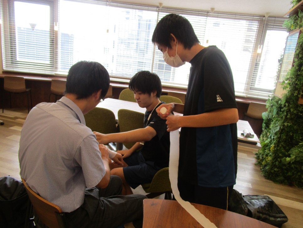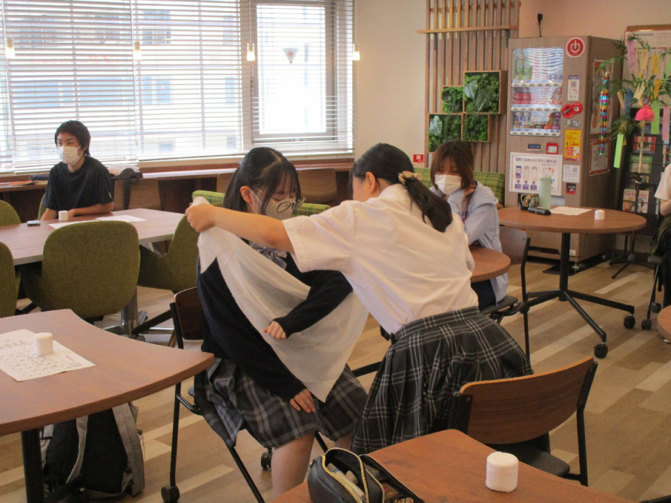 後半では、医療機器である包帯や三角巾を用いながら応急処置の仕方を学んだり、自分より大きな人の体位交換など、いざとなったときに役立つ方法を体験的に学びました。