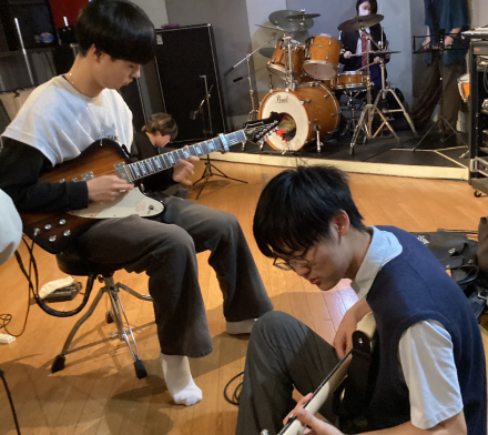 - 軽音では、ギター、ベース、ドラム、キーボードの4つの楽器を練習することができます。先輩や仲間と合わせながら練習するのはとても楽しいです。