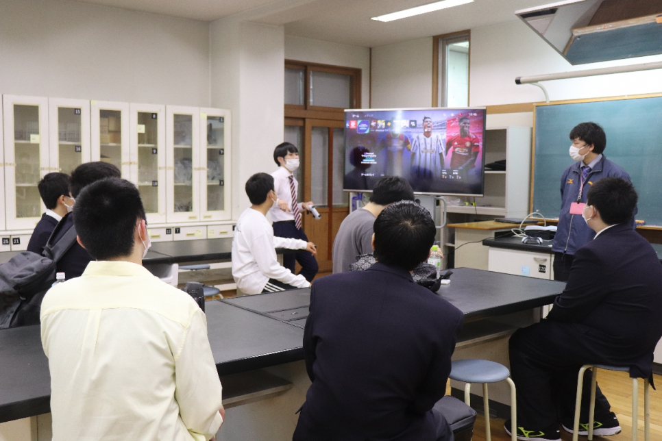 e-sports部説明会では、顧問の先生から昨年は茨城県ベスト4に進出することができたという話を聞いて、新入生から驚きの声が上がりました。説明会の後は、昨年導入したPS5を使ったレクレーションや自己紹介などを行いました。