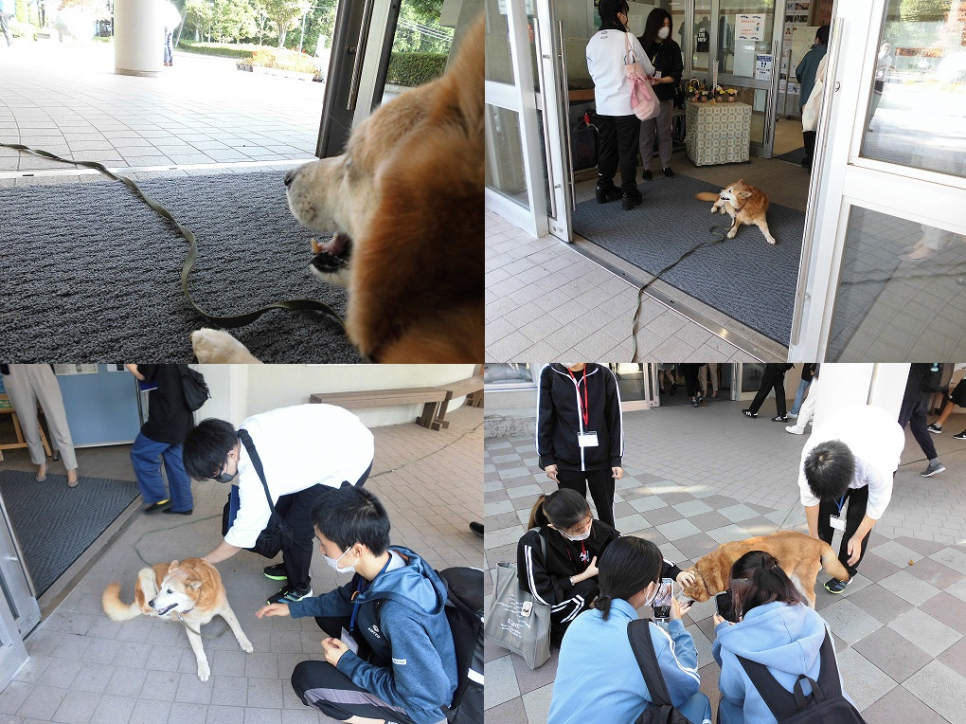 今日は学校飼育犬のさくらが朝から学校の玄関口で生徒たちを出迎えました。