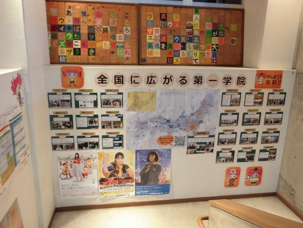 階段踊り場には、キャンパス紹介の掲示物や高萩の歴史を紹介した掲示物があります。高萩校に来たら、ぜひ見てくださいね!