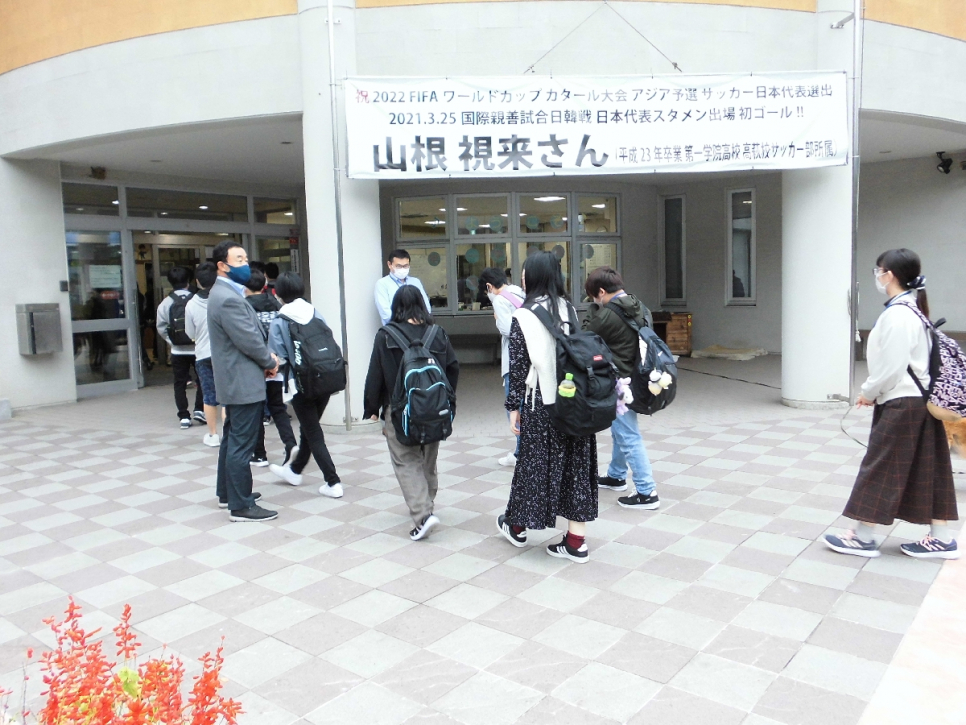 各キャンパスを出発したバスが無事高萩本校へ到着しました。バスから降りた生徒は、