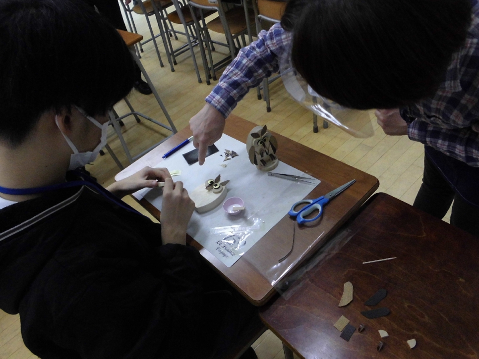 体験学習:ウッドクラフト(木工)です。フクロウを作っています。顔が出来上がりました。