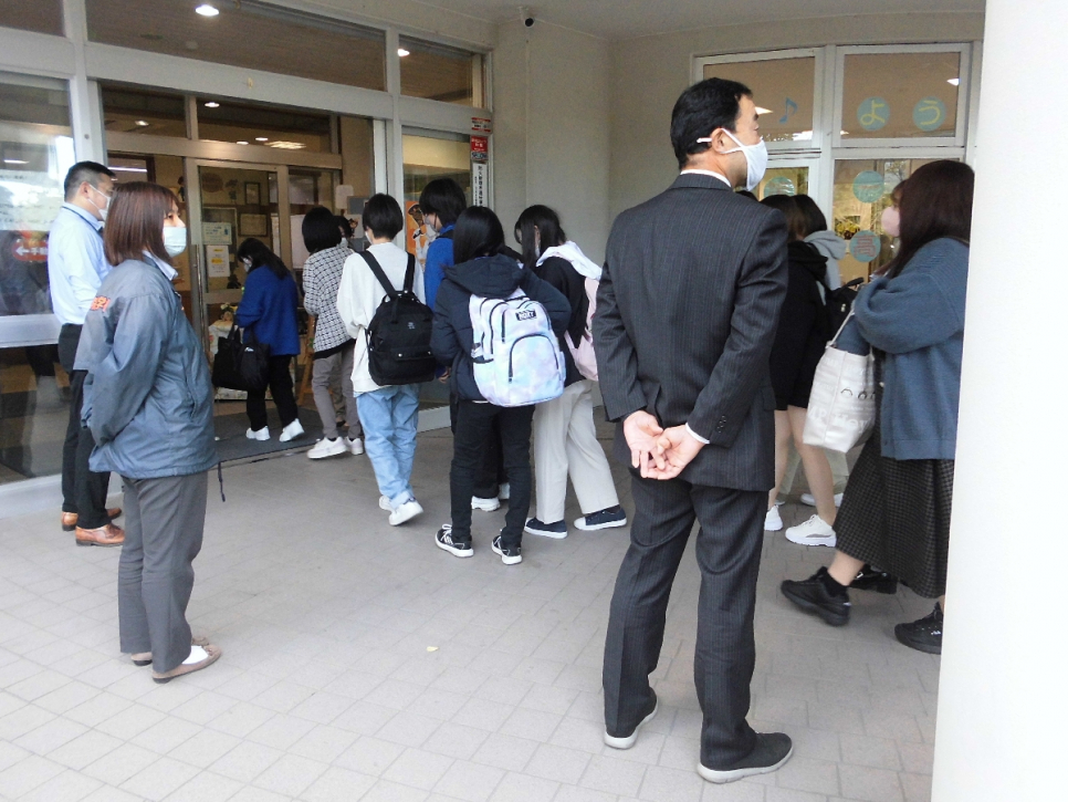 高萩校の校舎へ入っていく生徒たち。本校職員からの挨拶にも元気に答えてくれました!