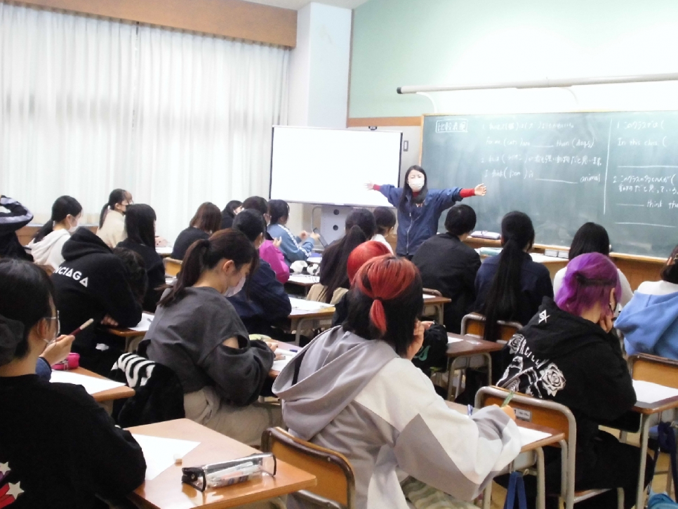 授業(英語コミュニケーションI)の様子。今日の授業は「比較表現」についてでした。「世界で一番長い川は?」の英訳問題を解答し、問題の答えについても「ナイル?アマゾン?」と楽しく授業が行われていました!