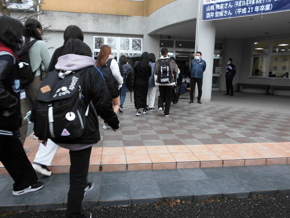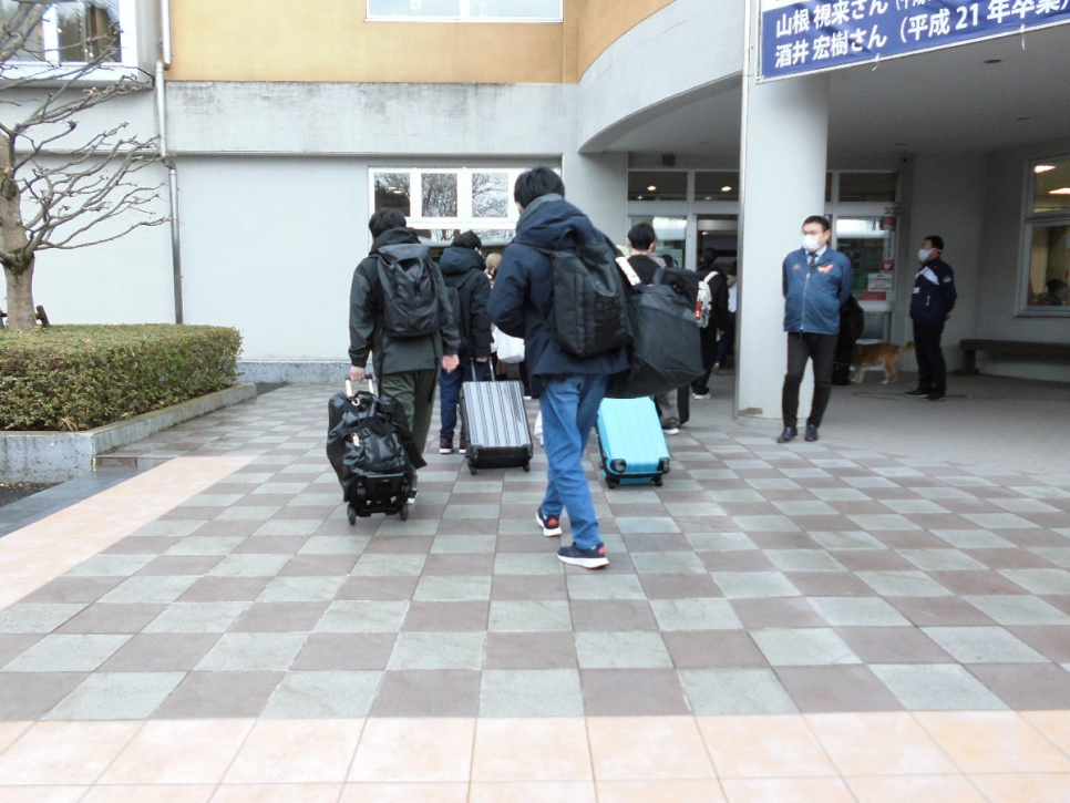 バスに乗って高萩本校に到着した生徒たちは、大きな荷物を手に校内へと入っていきます。