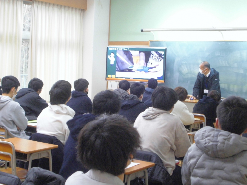 授業(科学と人間生活):実験の映像に興味津々、真剣に見入っています。