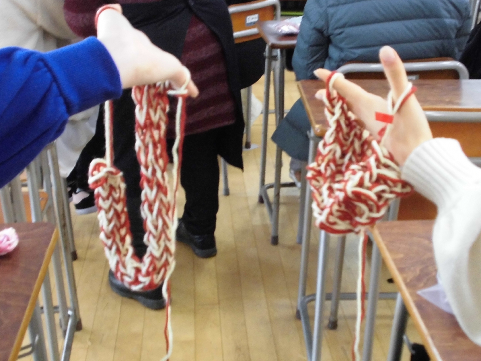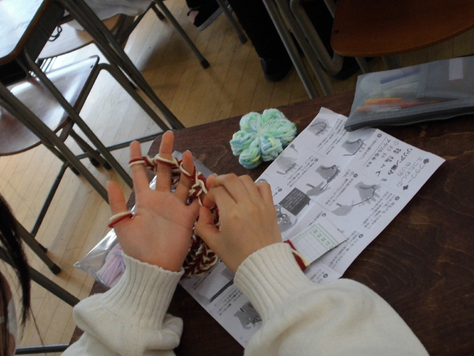 体験学習(エコたわし作り):完成まであと少し、最後まで友達と一緒に頑張っていました。