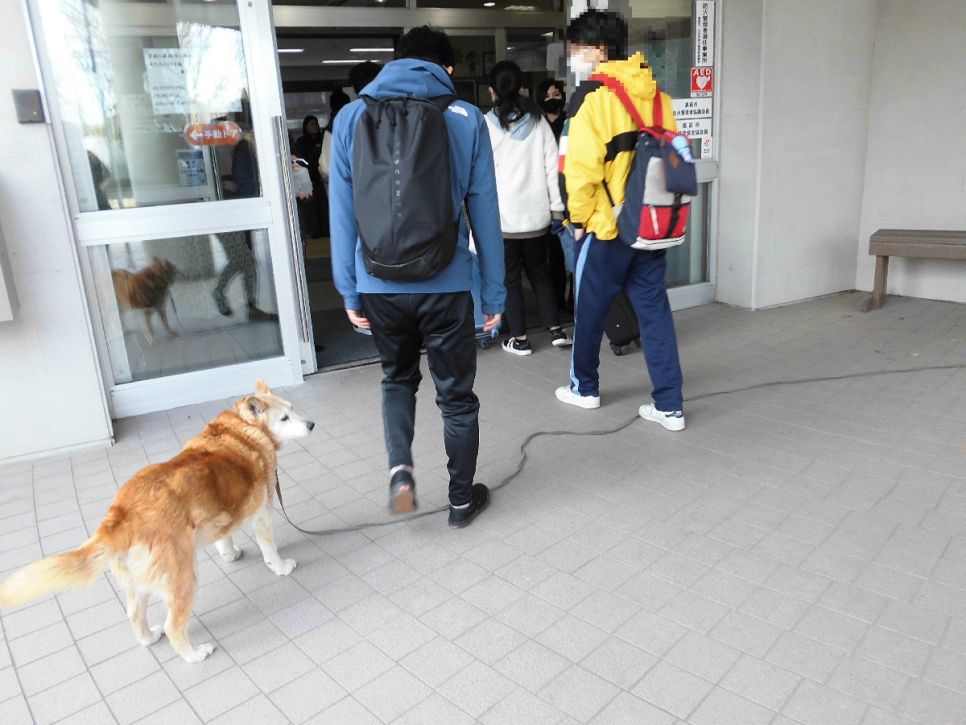 そんな中、生徒が元気に登校してきました。学校飼育犬のさくらも一緒に生徒をお出迎えです。