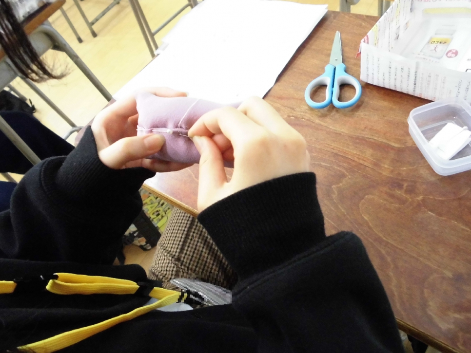 体験学習(吊しびな作り):とても丁寧にまっすぐ縫えていますね。