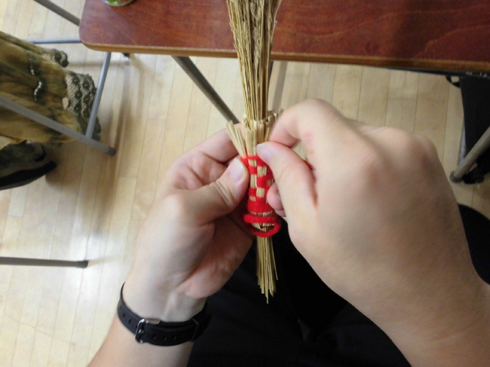 NPO里山文化ネットワークの講師の方に教えていただきながら、わらで小帚(こぼうき)を作っていきます。