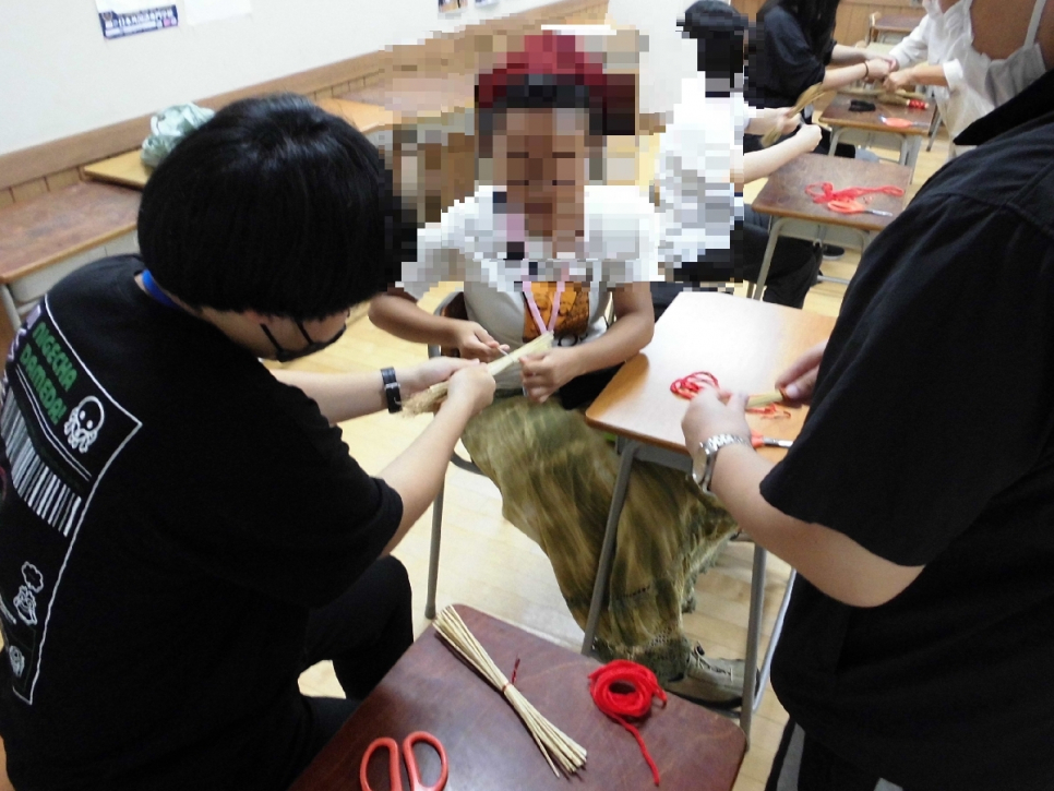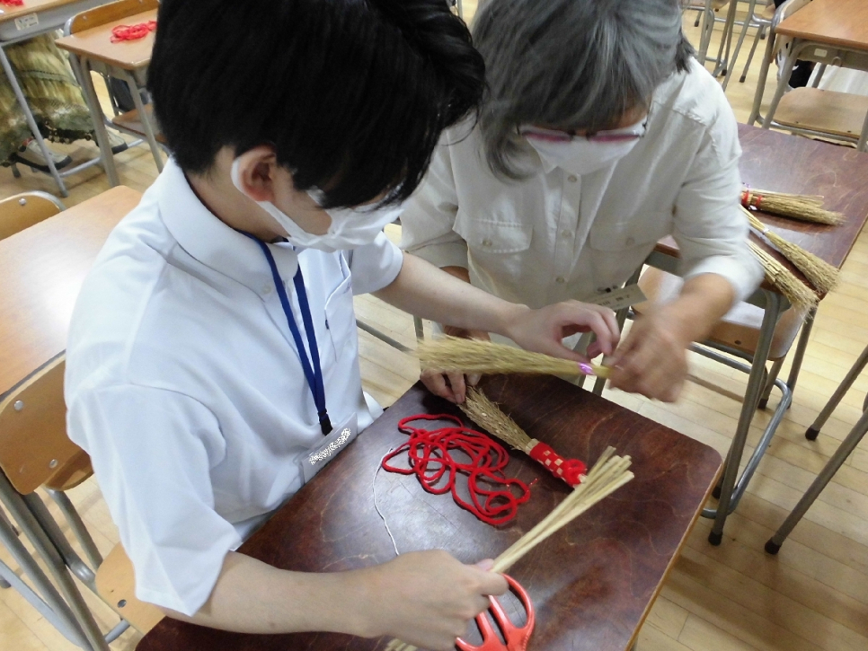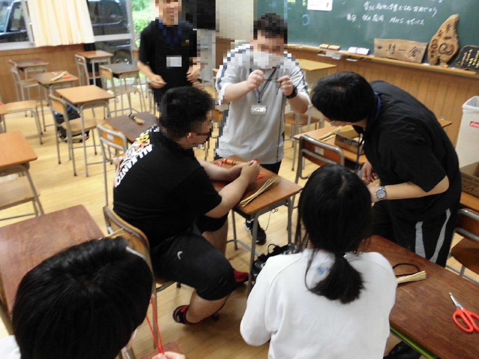 体験学習(わら細工):講師の方が優しく丁寧に教えてくれています。