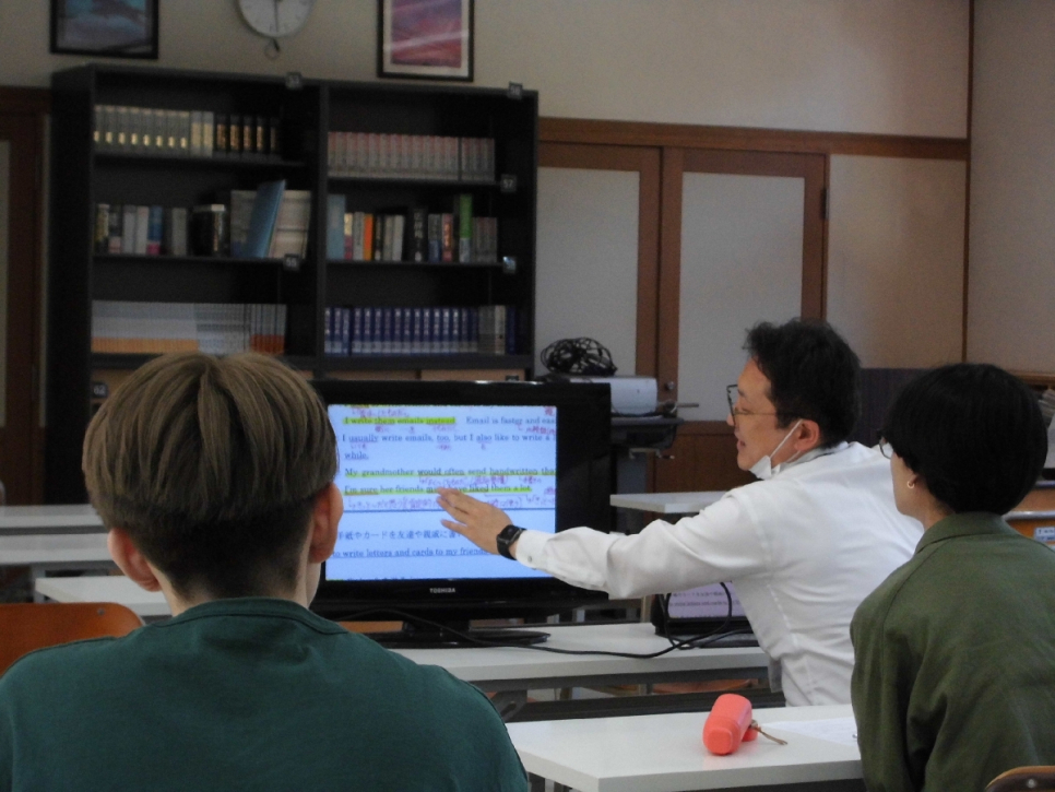 英語表現では、生徒から出た質問に対し一つ一つ例を出しながら進んでいき、授業が終わっても学習方法、自学自習で出た疑問など学習相談が続いていました。