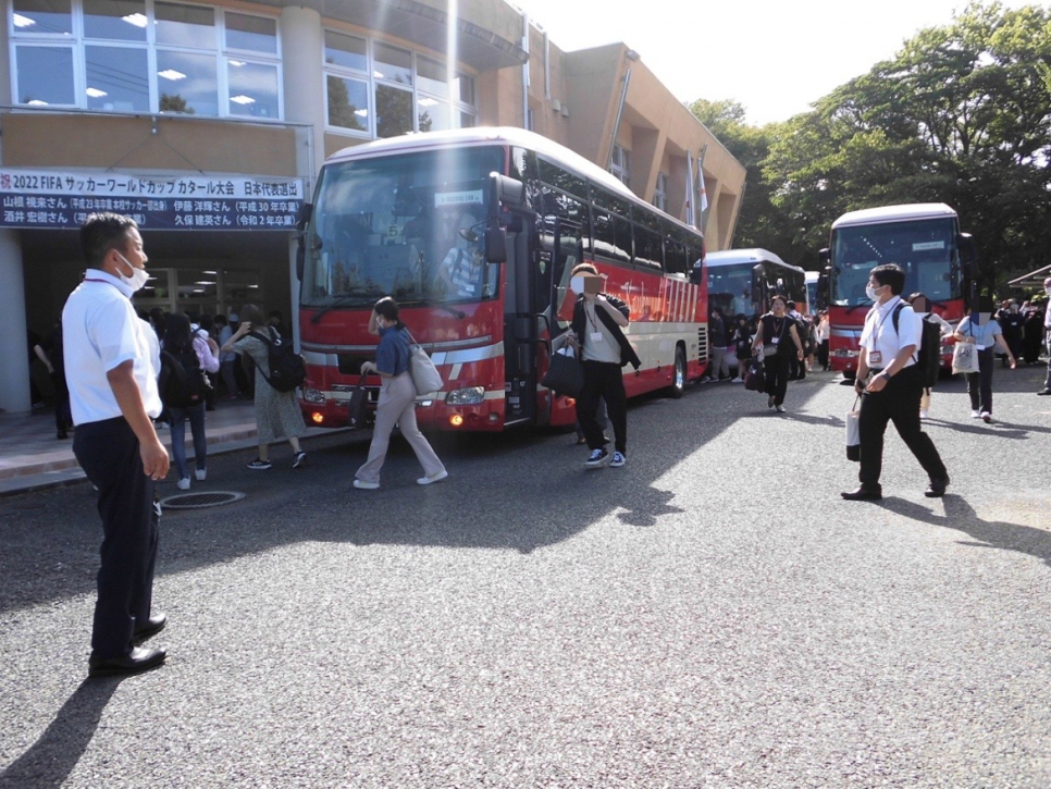 スクーリング初日、生徒を乗せたバスが無事、高萩本校へ到着しました。