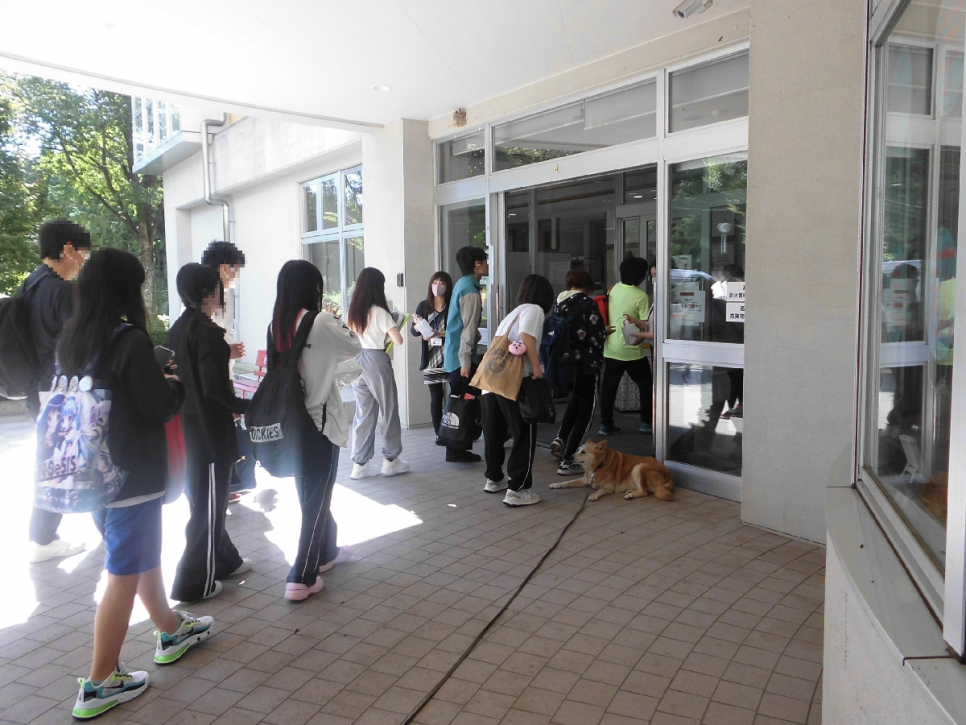 2日目の朝、生徒が元気に登校してきました。学校飼育犬のさくらも一緒に朝のご挨拶!