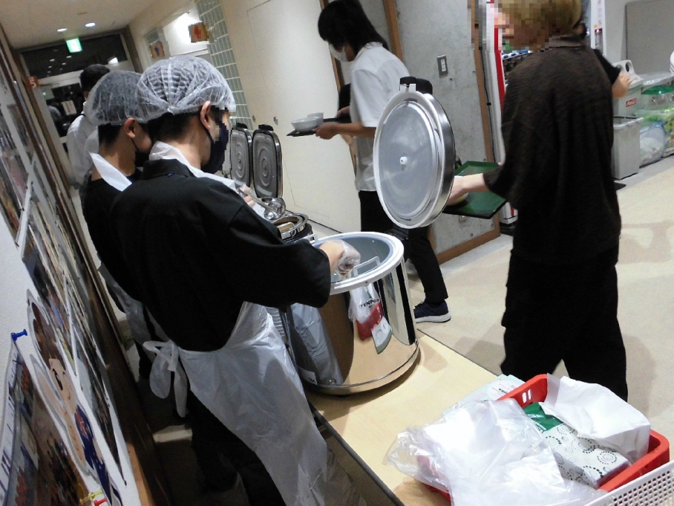 配膳します。一人ひとりに丁寧にご飯をよそっていきます。温かい夕食に生徒はとても嬉しそうでした。