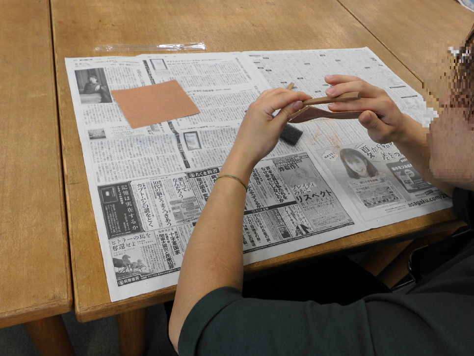 体験学習(箸作り):箸の角をやすりで滑らかにしていきます。箸を作るだけでなく、「お箸」という名前の由来も教えていただき、生徒は興味津々で聞いていました。