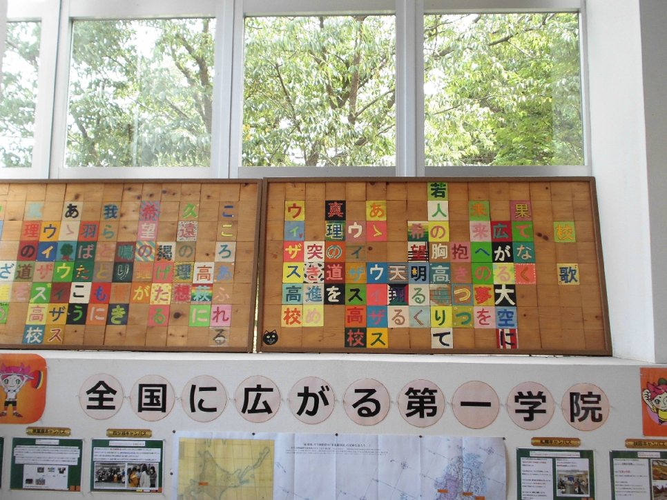 高萩校の階段には校歌が飾られています。スクーリング参加生には是非歌詞の変更になっている部分を見つけ第一学院の歴史を感じてほしいです。