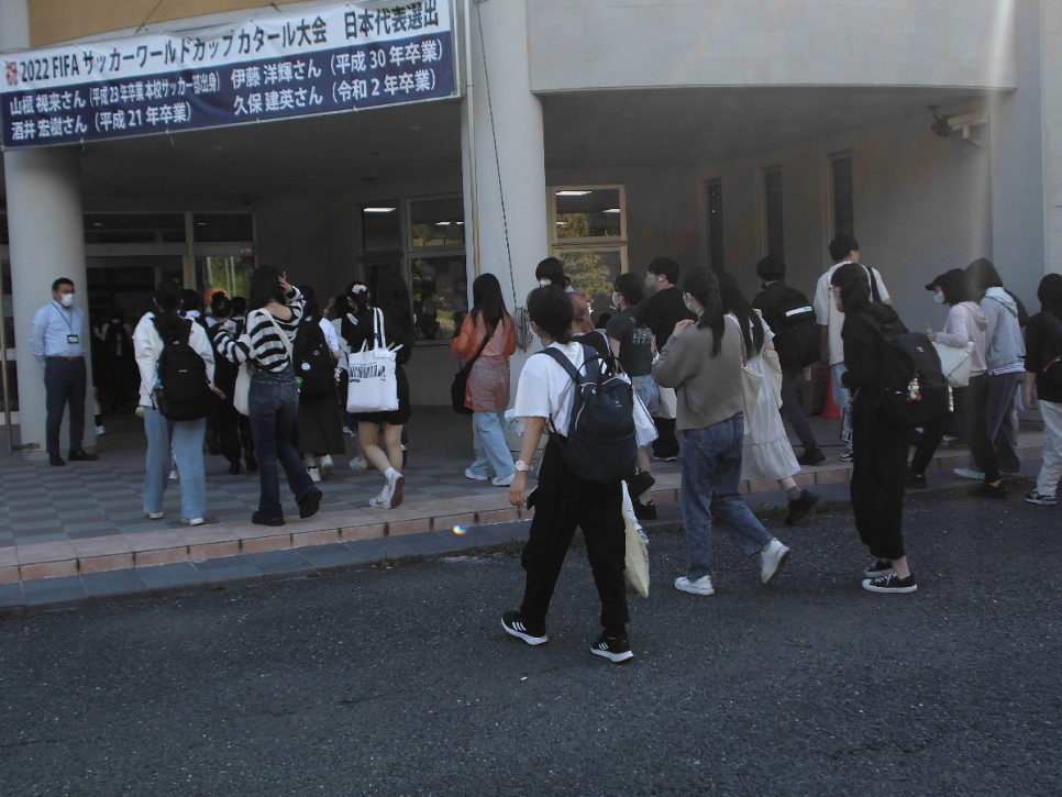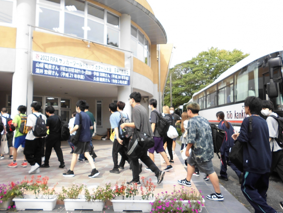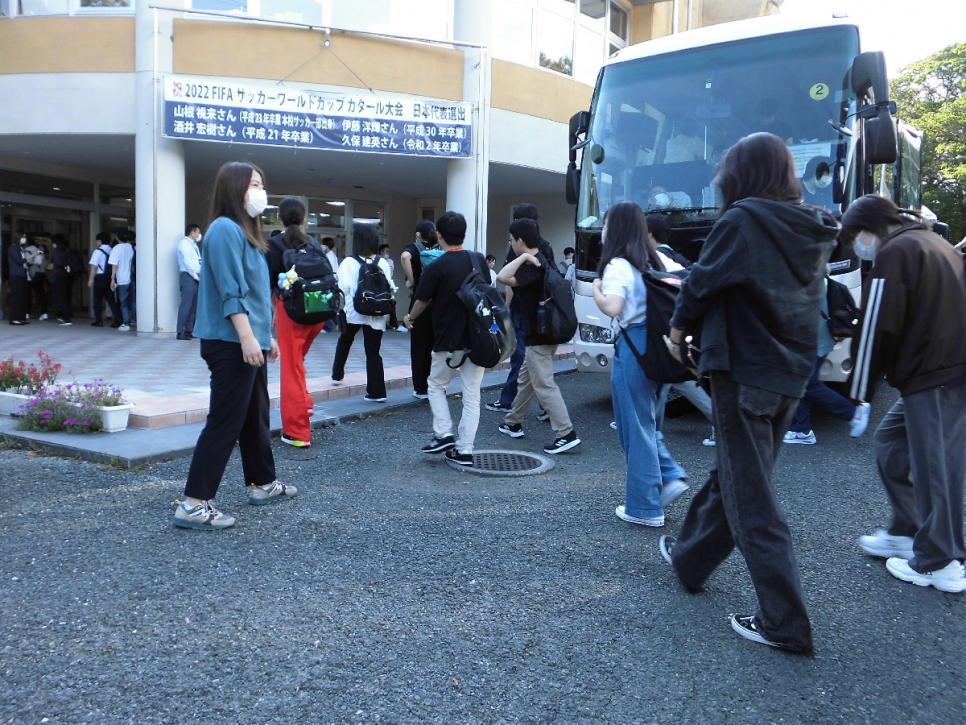 1日目、本校到着後バスから降車し校内へと移動する生徒達です。