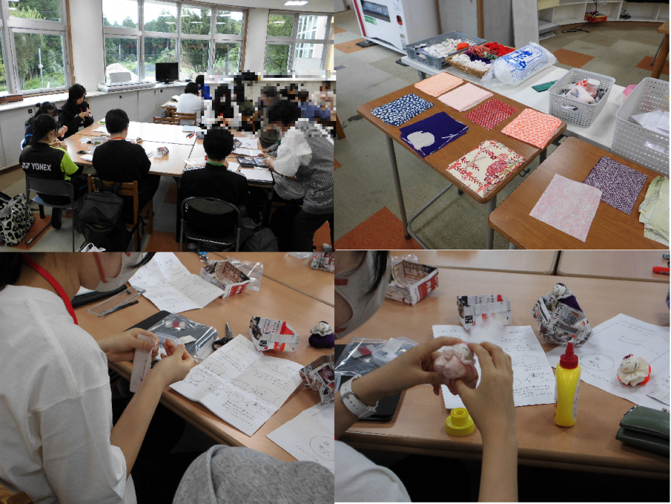 体験学習の様子です。色とりどりの布の中から好みの布を選んで吊しびなを完成させていました。