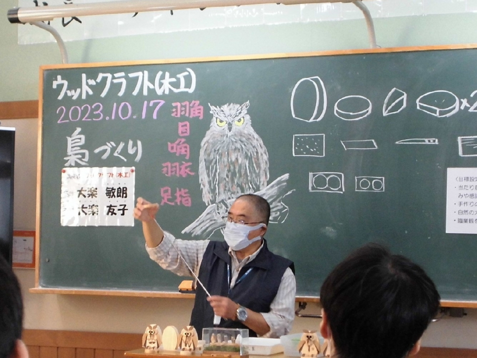 体験学習【ウッドクラフト(木工)】の様子①。講師の方の後ろの黒板に書かれているフクロウですが、毎回講師の方の手書きなんです!上手すぎます!