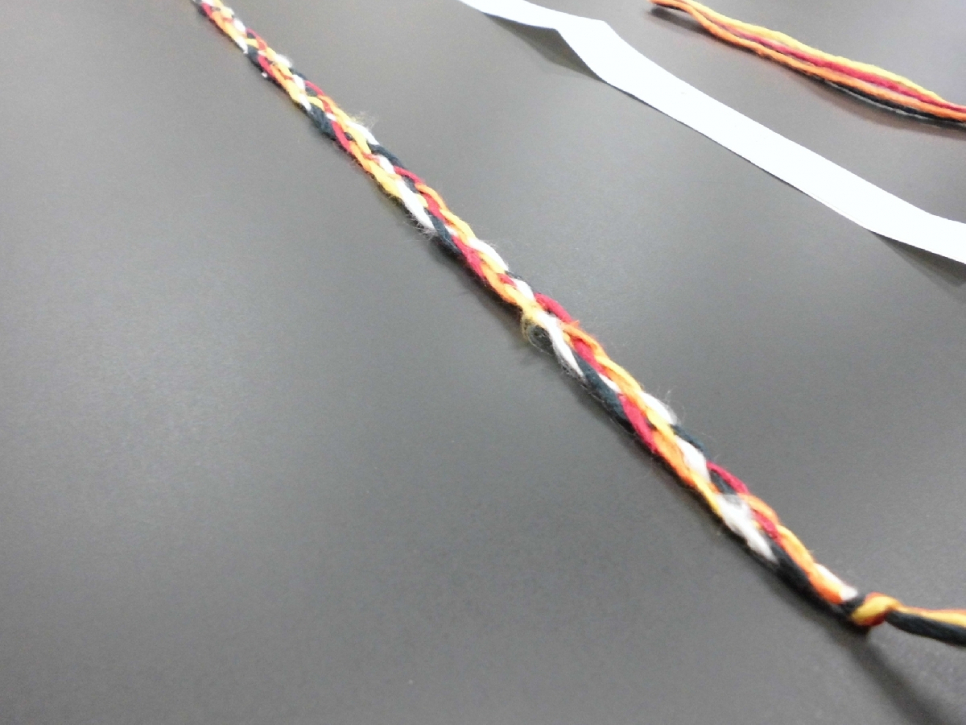 体験学習【織り編みミサンガ作り】での作品です。5本の糸で編まれています。古風な感じで素敵な仕上がりですね!