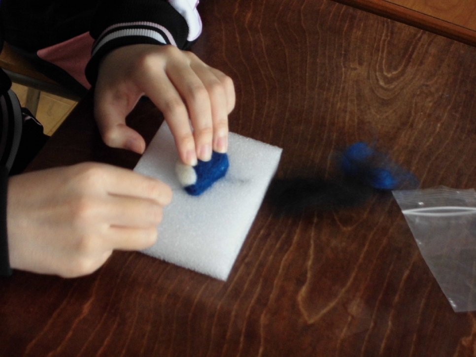 羊毛フェルトの様子です。丁寧に一刺し一刺し工程を積み重ね完成を目指します。