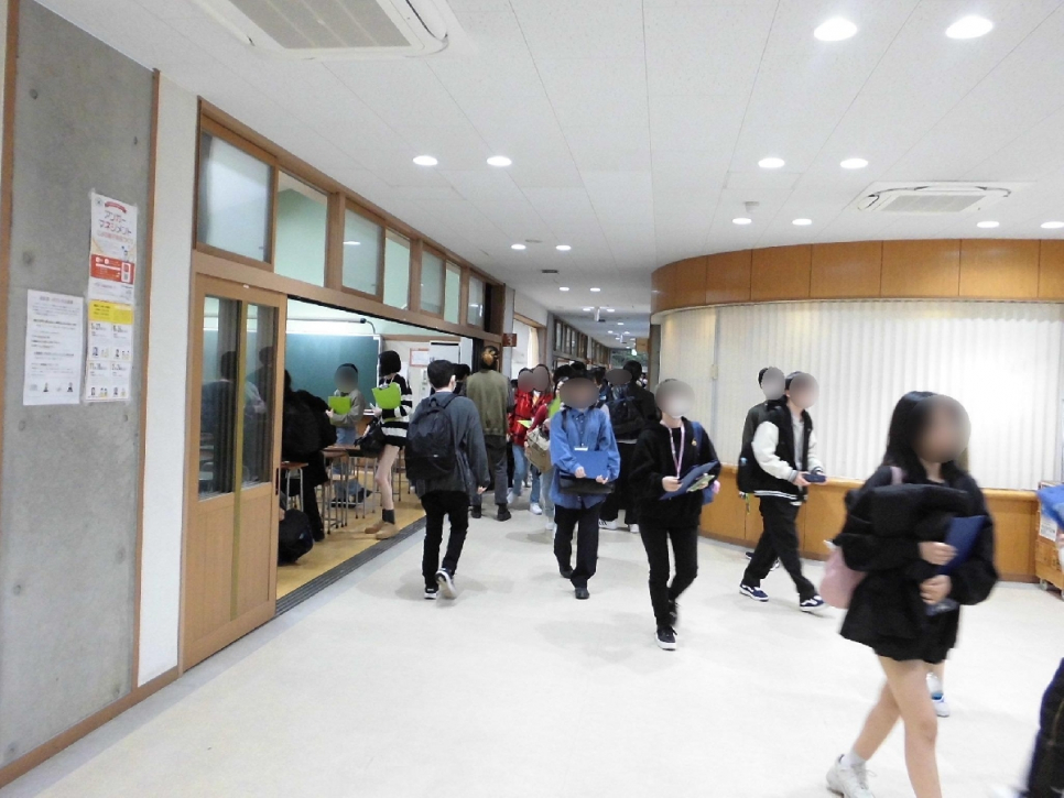 自分の時間割を確認し、受ける授業の教室へ移動する生徒たちの様子。