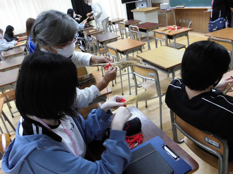 体験学習わら細工の様子。作業の途中分からなくなっても講師の方が丁寧に教えてくれるので安心です。