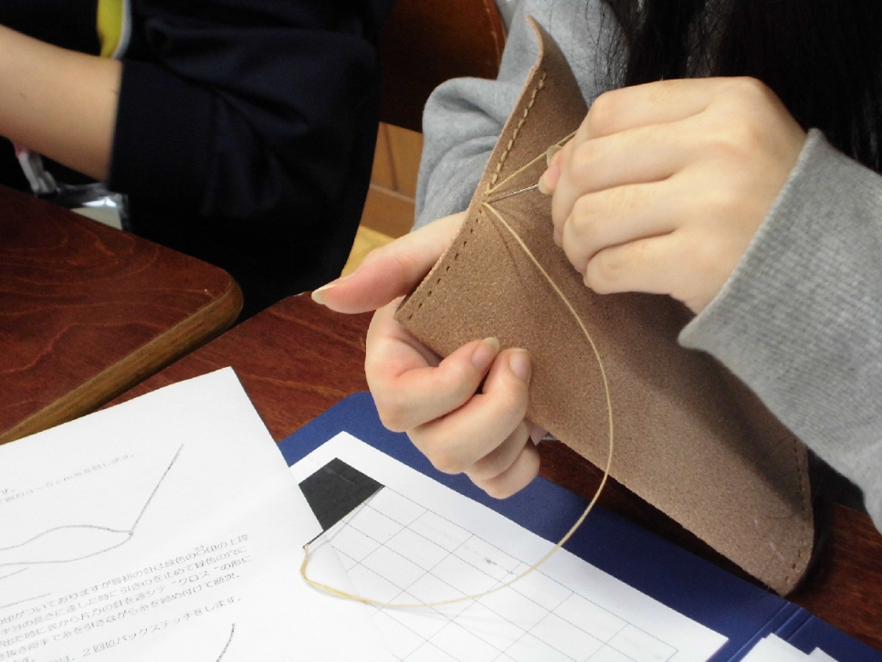 体験学習レーザークラフトの様子。革製品で硬いですがゆっくり丁寧に作業を進めていました。縫い目がとてもきれいですね!