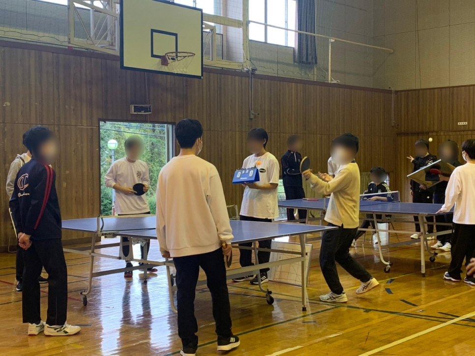 (体育)卓球の様子。ダブルスで仲間と協力プレー。あちこちで歓声が飛び交っていました!