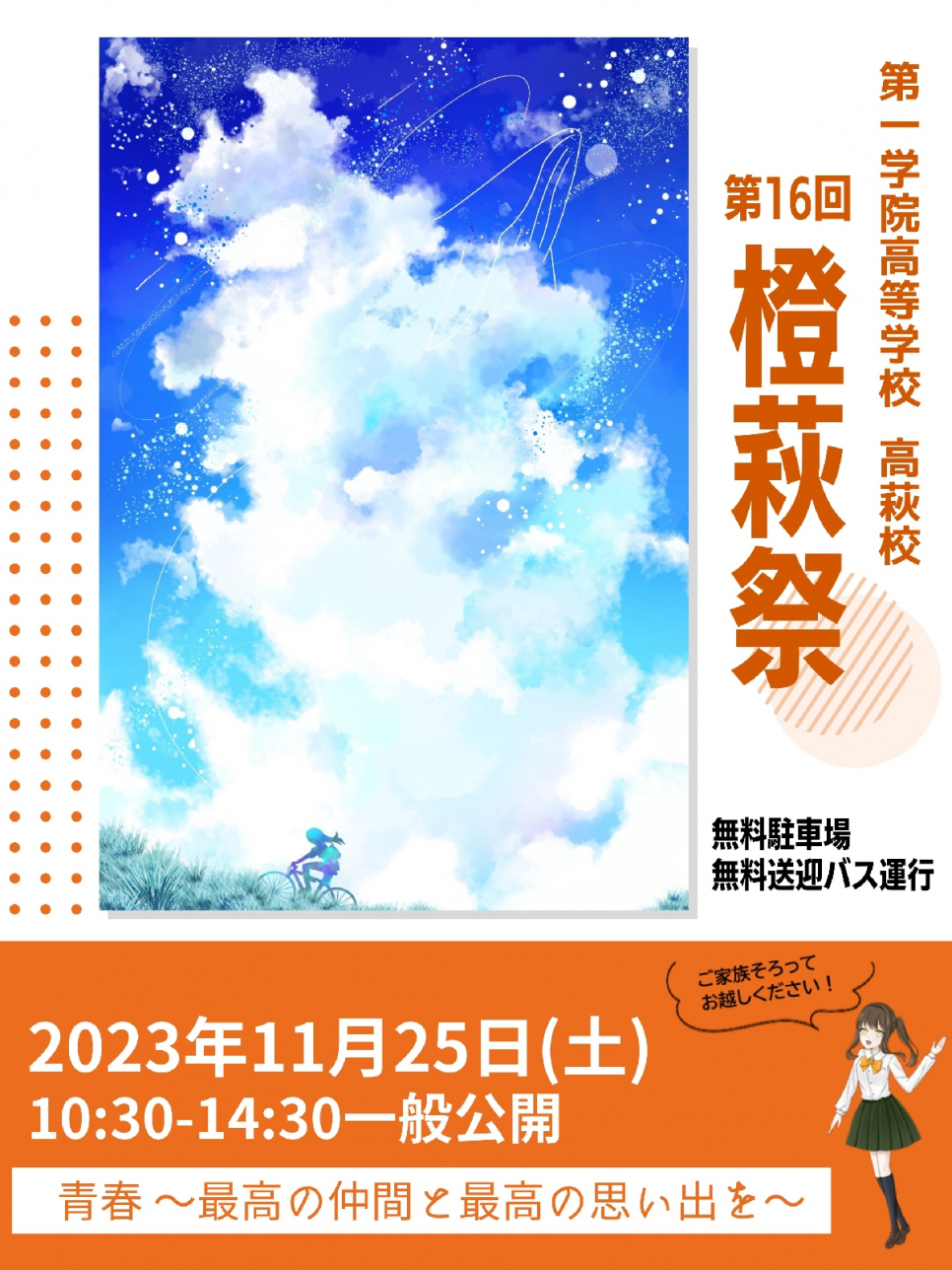 第16回橙萩祭!今回のテーマは「青春 〜最高の仲間と最高の思い出を〜」(3年次:大縄 めいさん),ポスターは2年次:佐藤 琉南さん,祭キャラクターは1年次:福富 梨央さんが採用されました