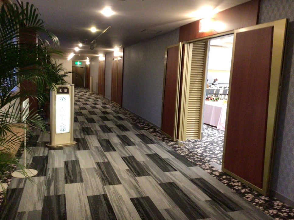 宿泊先のホテルハワイアンズです。廊下には南国リゾート感がある観葉植物が所々置かれてリラックス効果抜群。写真右側は朝食会場です。