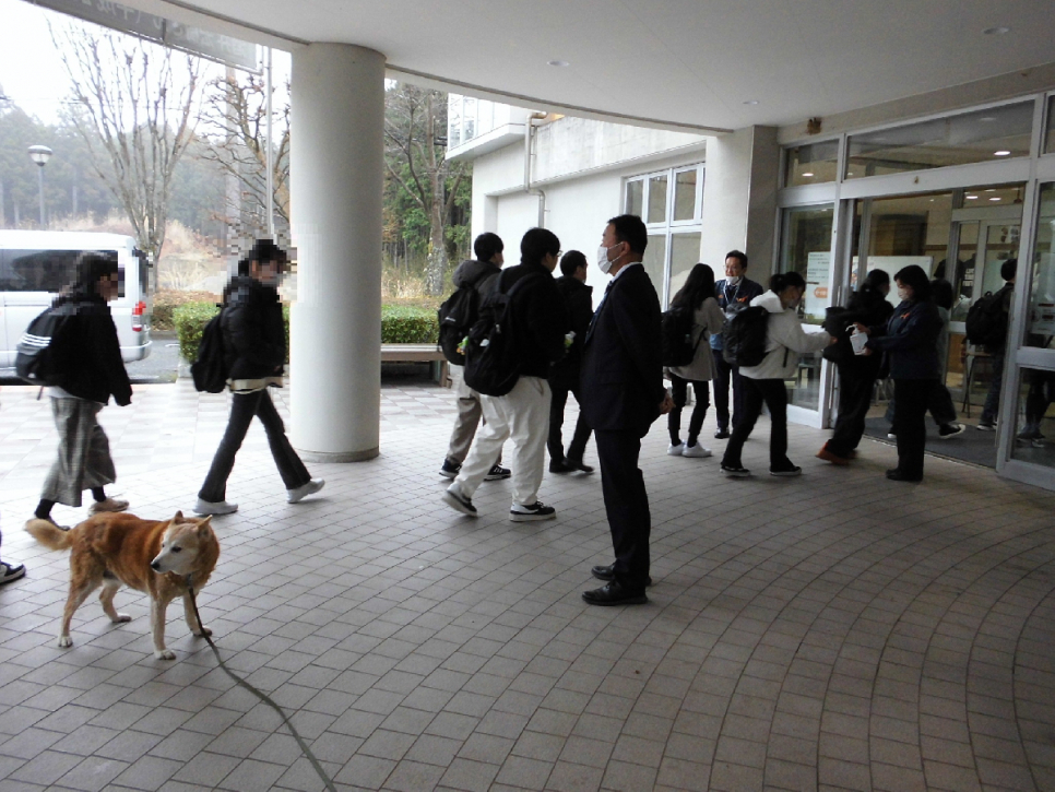 生徒を乗せたバスが無事、高萩本校へ到着しました。学校飼育犬のさくらも一緒にお出迎えです。