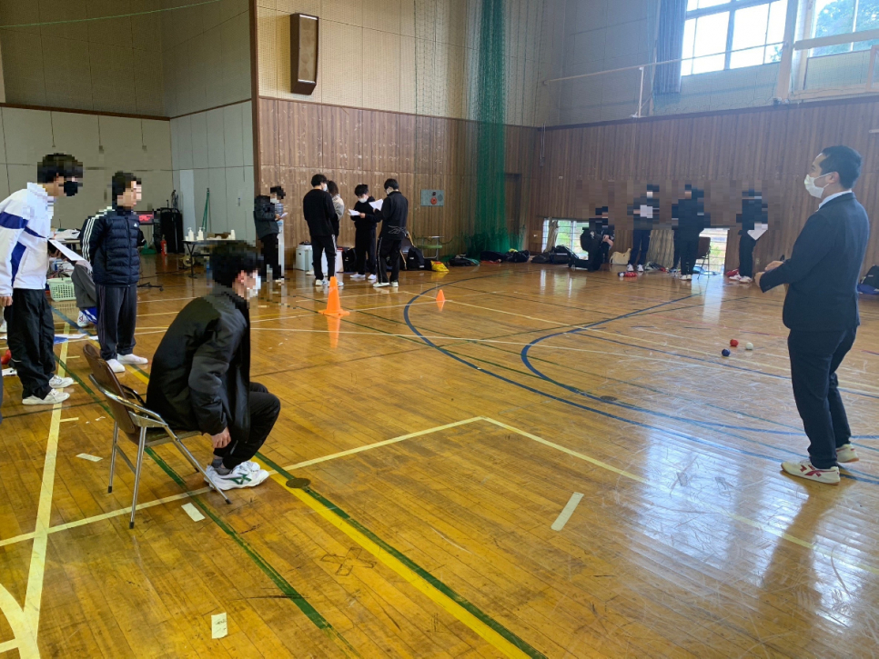 体育の様子:ボッチャという競技です。投げる位置を真剣に見定めています。