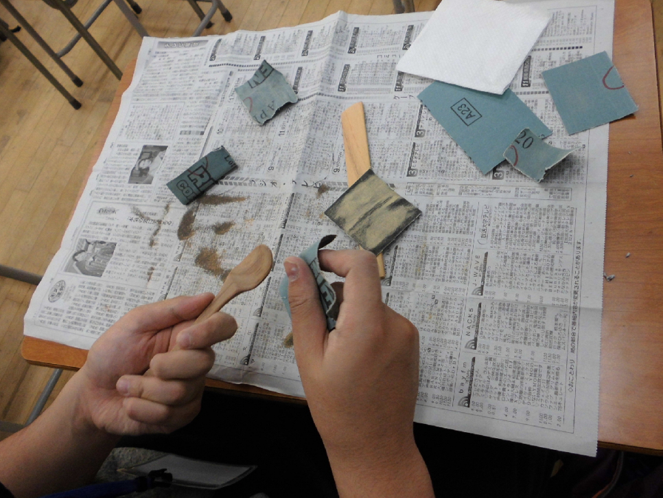 体験学習(バターナイフ・ジャムスプーン作り) 木をやすりがけし、スプーンとナイフの形にしていきます。あと少しで完成ですね!