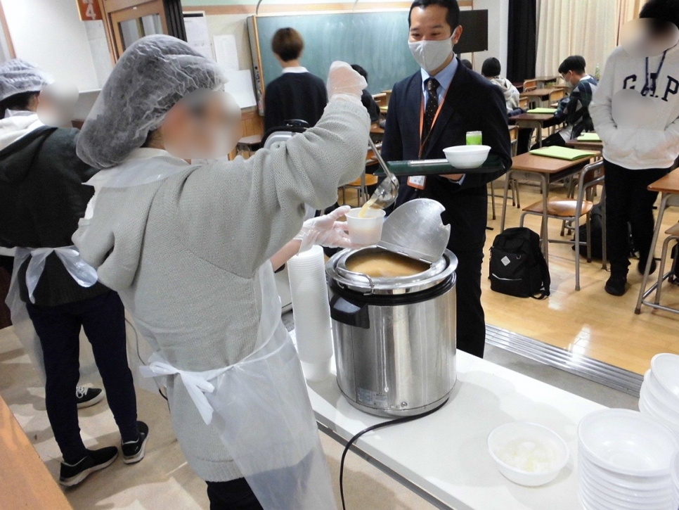 1日目夕食の様子:生徒が率先して配膳をしてくれています。いい匂いが漂う中、「お腹すいた~」と生徒たち。ほっと一息つける時間ですね。